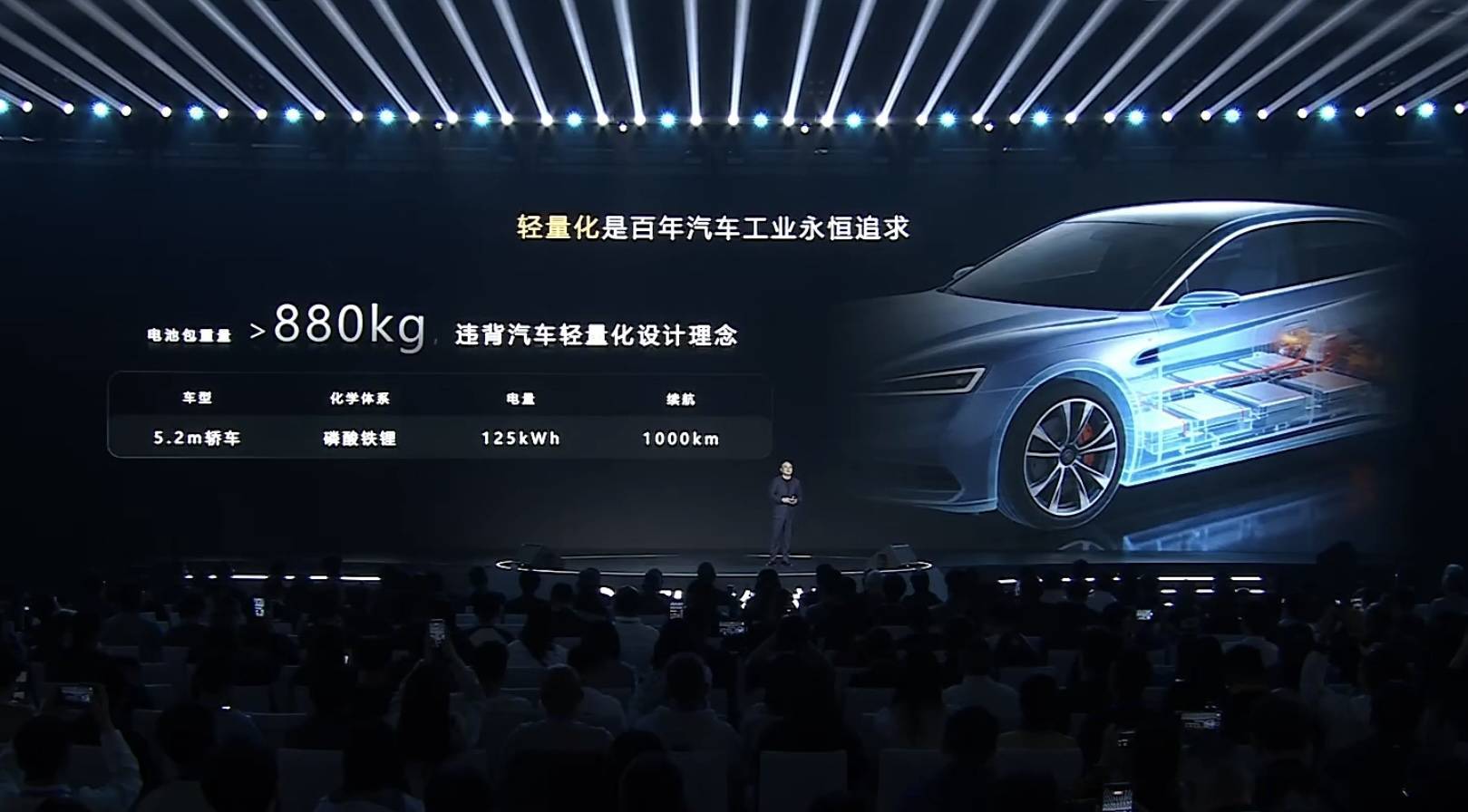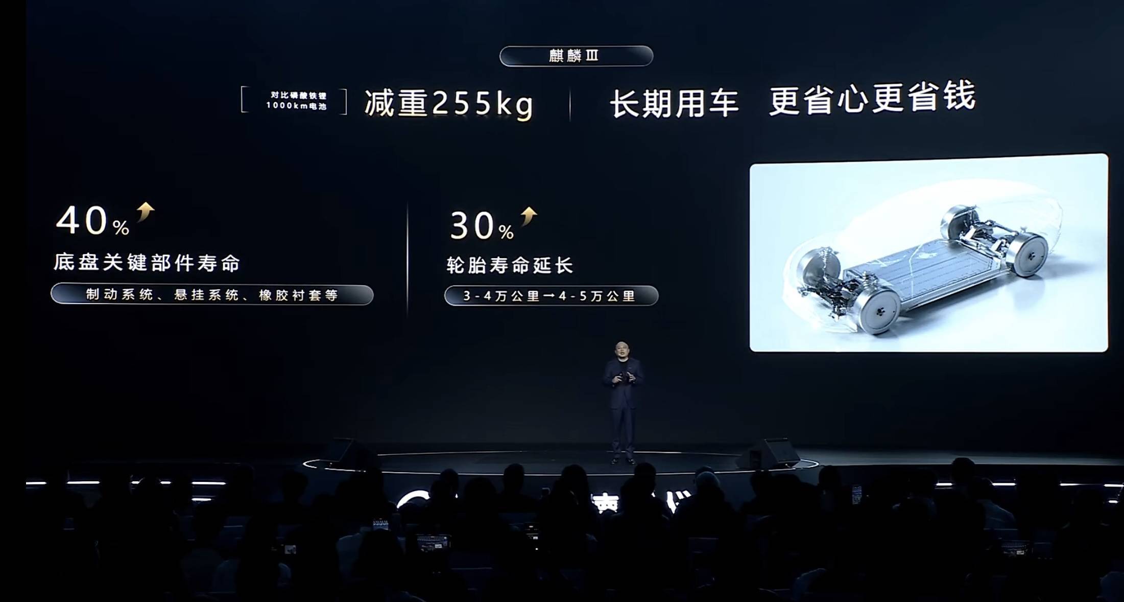 同样是跑一千公里,用三元锂的麒麟三代,电池包重量定在了 625 公斤,比同级别的铁锂方案足足轻了 255 公斤,车里直接少了三个成年壮汉的重量。
