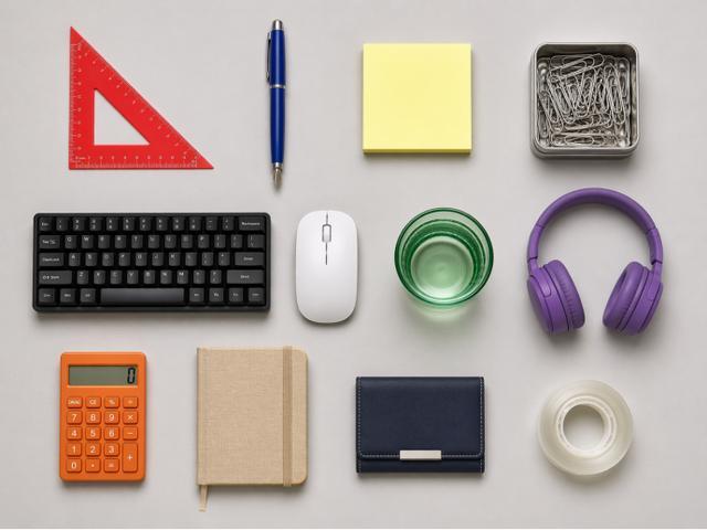 要求所有物体大小均衡、边界清晰、位置准确、不重叠、不遗漏,整体风格像高质量办公用品平铺摄影。