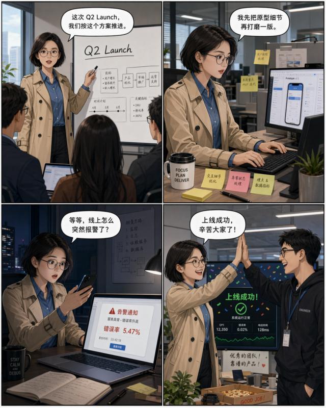 第一格:她在晨会里介绍方案,白板上写“Q2 Launch”
