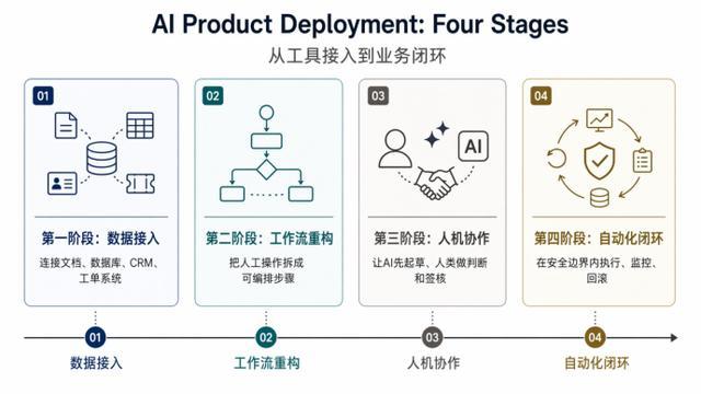 底部有一条时间轴,上方有标题“AI Product Deployment: Four Stages”,下方有中文副标题“从工具接入到业务闭环”。请为每列使用不同但克制的商务配色,每张卡片内要有简洁图标、标题和两行说明文字。整体风格像麦肯锡或红杉资本会使用的报告图表,清晰、可读、可用于演讲材料。