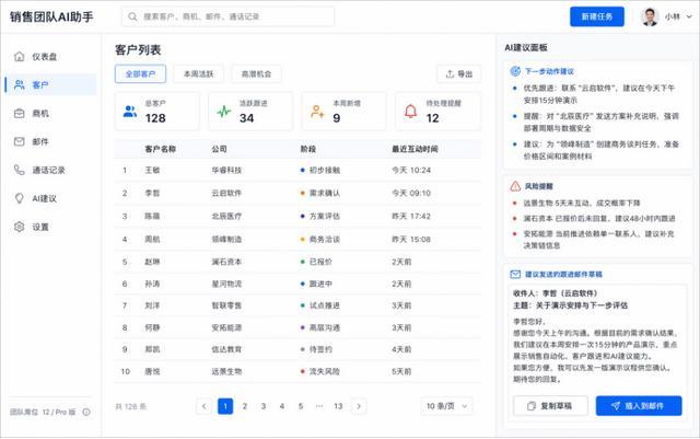右侧侧栏:AI建议面板,显示“下一步动作建议”“风险提醒”“建议发送的跟进邮件草稿”