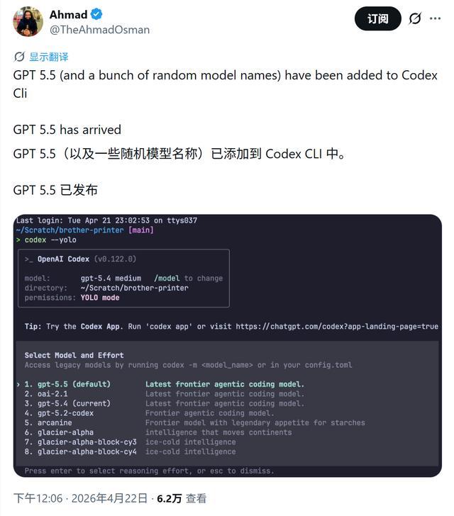 IT之家 4 月 22 日消息,OpenAI 今天(4 月 22 日)发布 ChatGPT Images 2.0 生图工具外,其偷跑的 GPT-5.5 模型迅速成为网友热议焦点。根据部分网友反馈,在 Codex CLI 终端界面,意外出现了 GPT-5.5 模型,显示为“最前沿的智能体编程模型”。