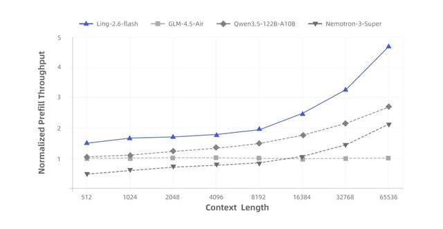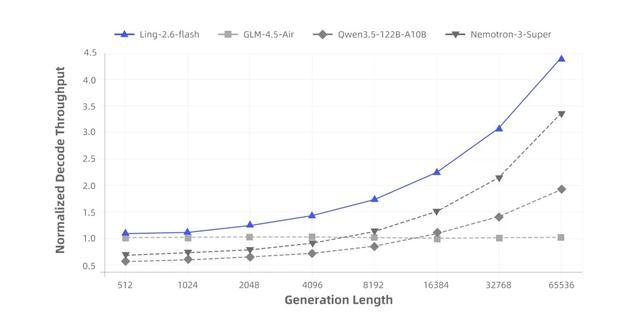 得益于混合注意力机制与高度稀疏化的MoE架构,Ling-2.6-flash在推理效率上优势显著。与同尺寸级别的主流SOTA模型相比,首字响应更快,长输出场景下的生成效率更高,Prefill吞吐与Decode吞吐最高均可达到约4倍提升。随着上下文长度和生成长度增加,吞吐优势进一步放大。