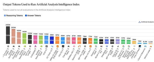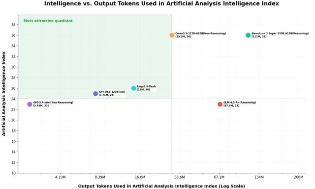 从token消耗看,在 Artificial Analysis Intelligence Index 的完整评测中,Ling-2.6-flash的总消耗仅为15M tokens,而Nemotron-3-Super等模型达到或超过110M tokens——仅用约1/10的token消耗完成同类评测任务,智效比更高。