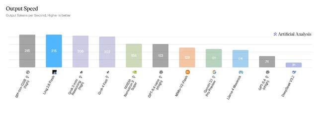 在Artificial Analysis榜单的Output Speed维度测评中,Ling-2.6-flash以215 tokens/s的输出速度处于第一梯队。