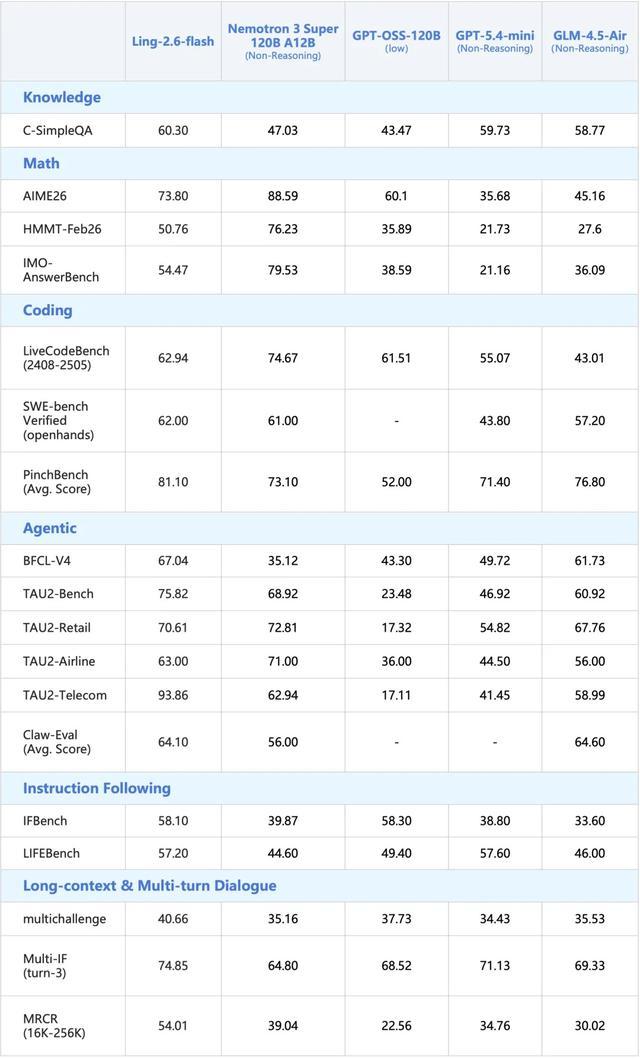 此外,Ling-2.6-flash在通用知识、数学推理、指令遵循及长文本解析等维度保持优秀水准,各项指标对齐同尺寸SOTA模型。