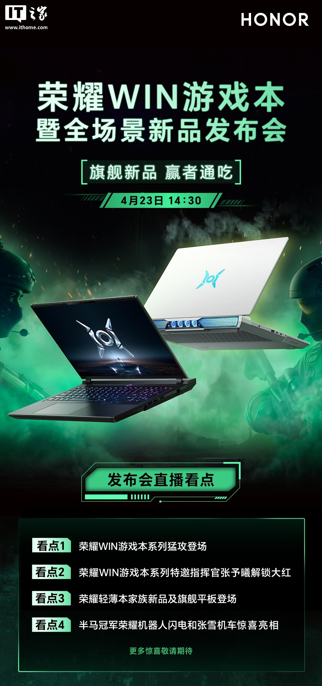 据IT之家此前报道,荣耀将在今晚举行荣耀 WIN 游戏本暨全场景新品发布会。官方表示,半马冠军荣耀机器人闪电和张雪机车也会在发布会上亮相。