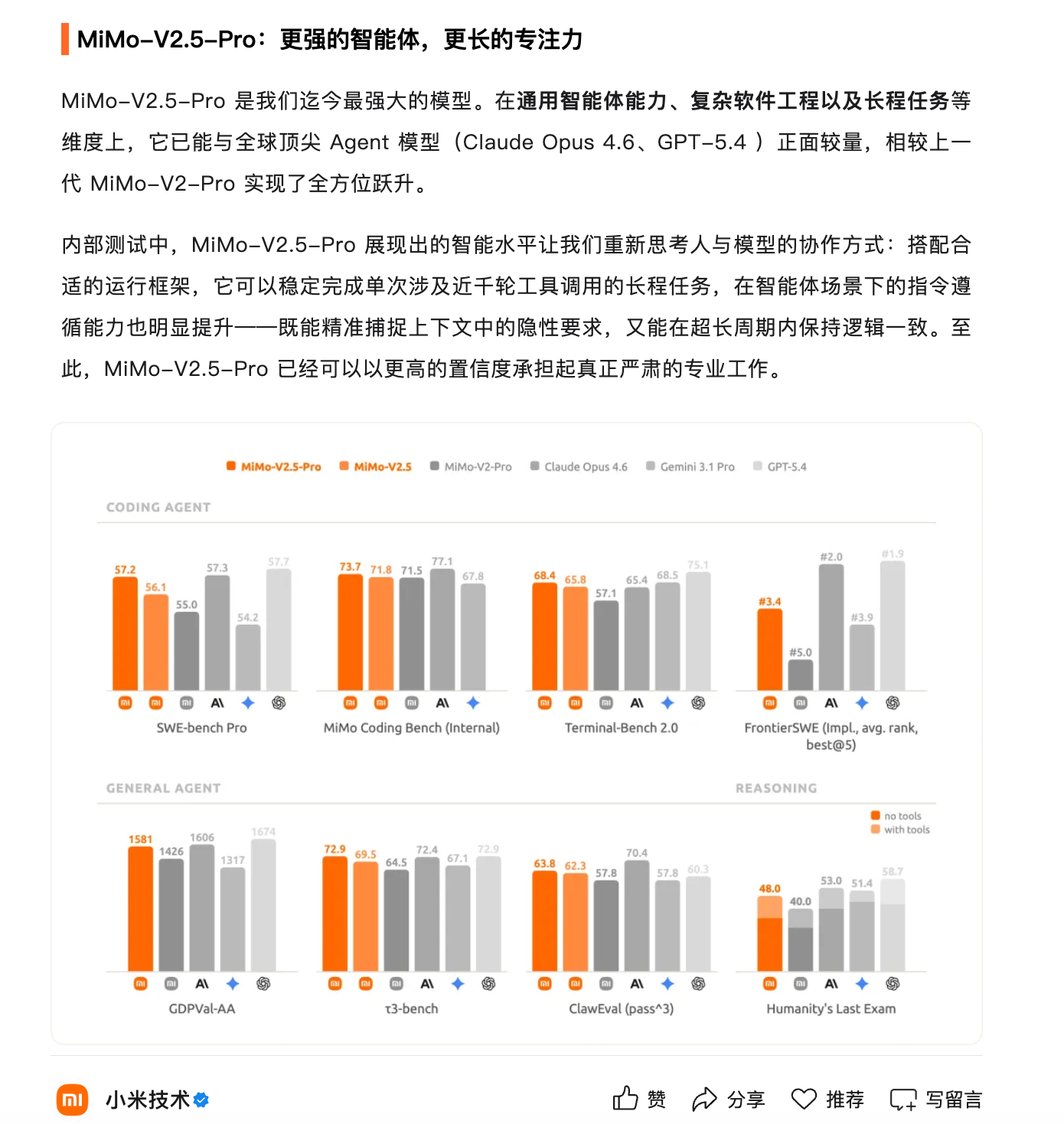 其中,旗舰型号MiMo-V2.5-Pro被定位为“为长难Agent任务而生”。据官方披露,在通用智能体、复杂软件工程等维度上,其表现已可对标Claude Opus 4.6、GPT-5.4等全球头部模型。