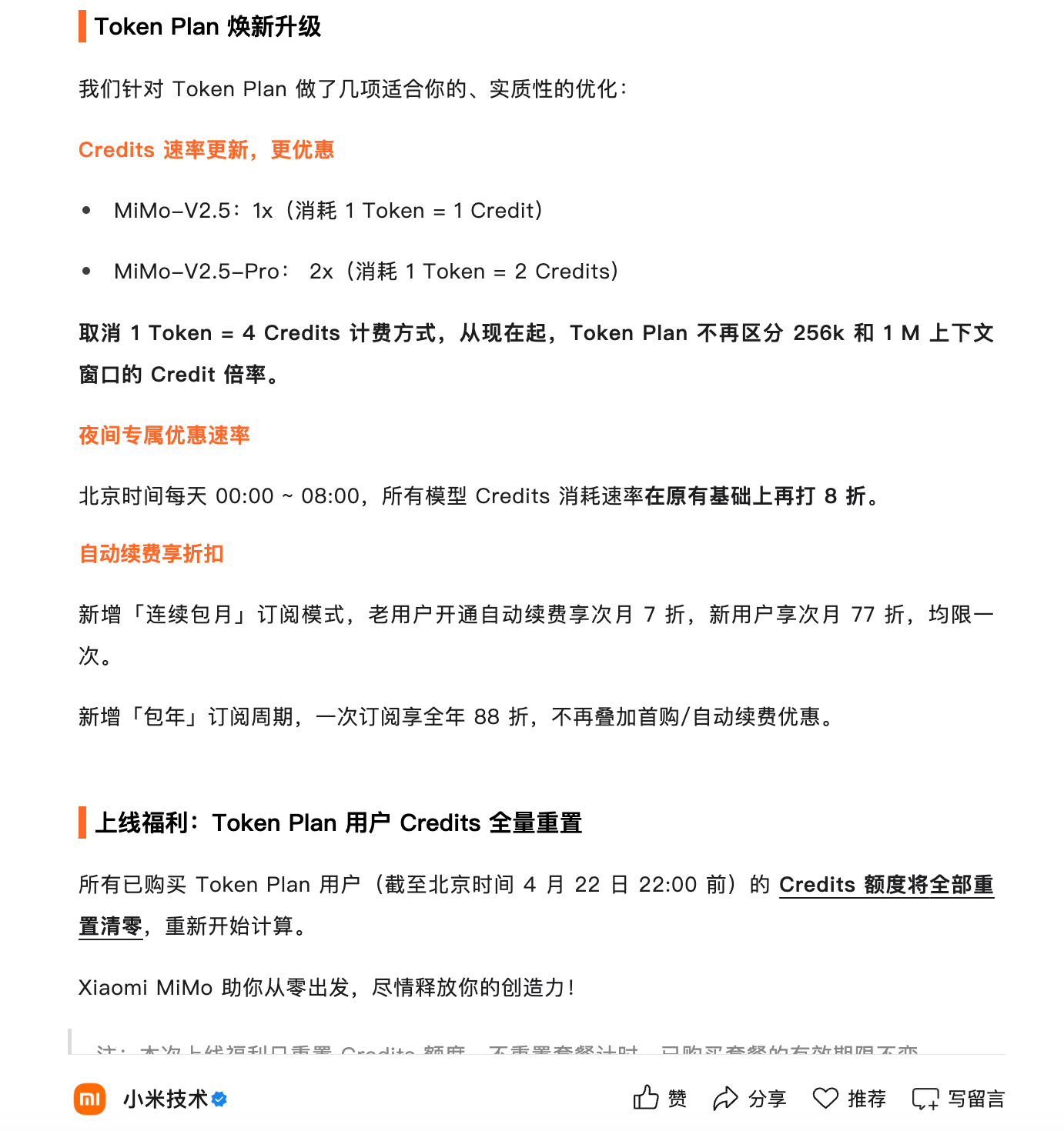凤凰网科技讯 4月23日,小米官方宣布,Xiaomi MiMo-V2.5系列模型正式开启公测。该系列模型包含MiMo-V2.5、V2.5-Pro、V2.5-TTS Series、V2.5-ASR。重点升级了智能体(Agent)能力、长上下文处理与全模态感知。