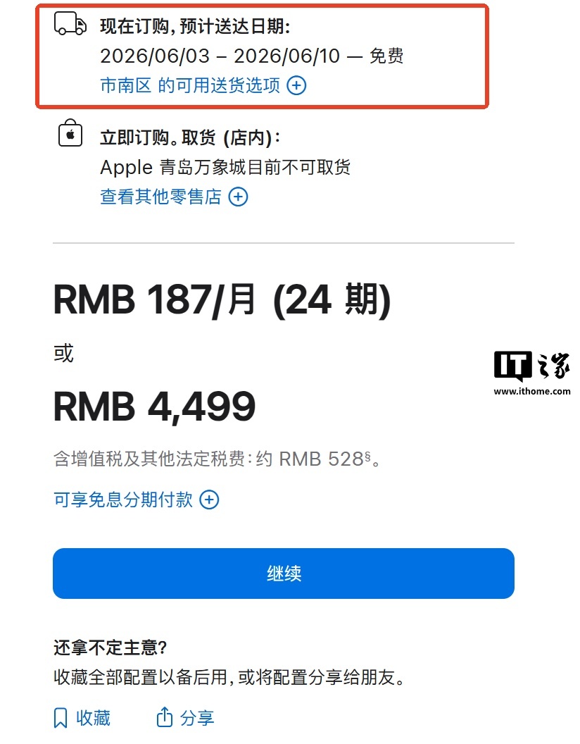 IT之家查询苹果中国官网,目前 M4 Mac Mini 基础版(售价 4499 元,点此前往苹果官网选购)依然显示有货状态,但是发货日期已经延长到 2026 年 6 月 3 日至 10 日。