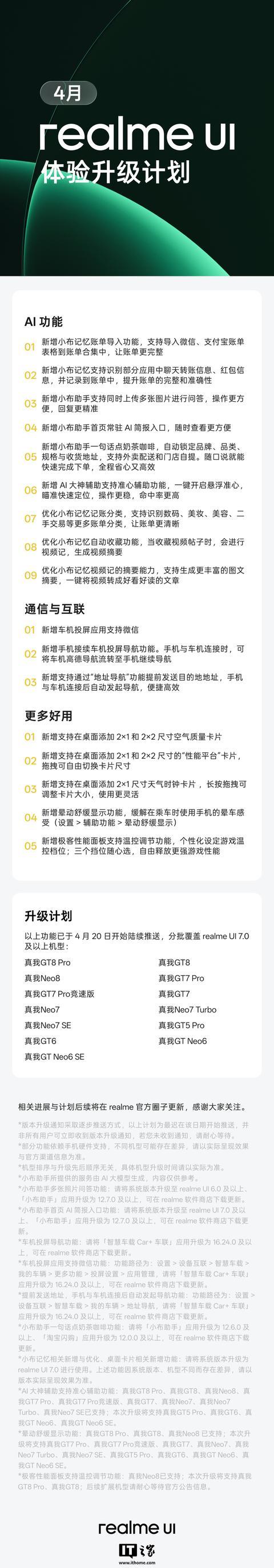 IT之家附 realme UI 系统 4 月体验升级计划如下: