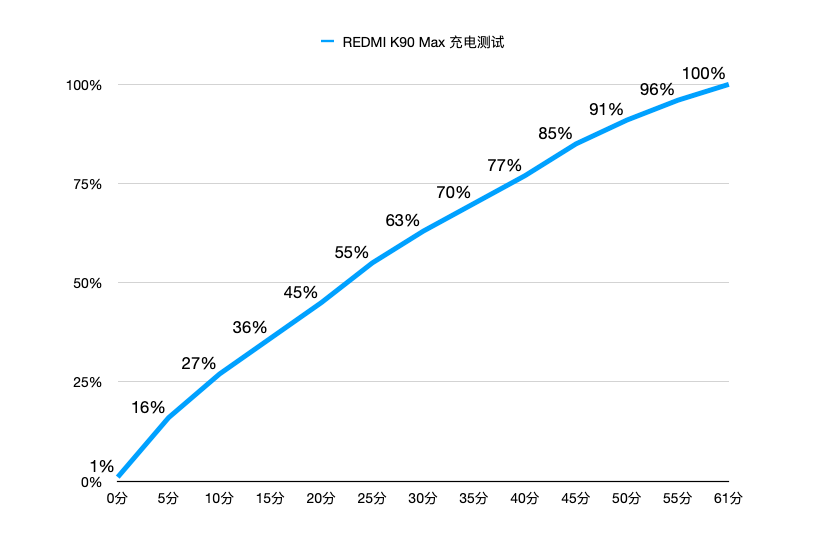 支持 100W 有线快充,从 1% 到充满,共用时 61 分钟。