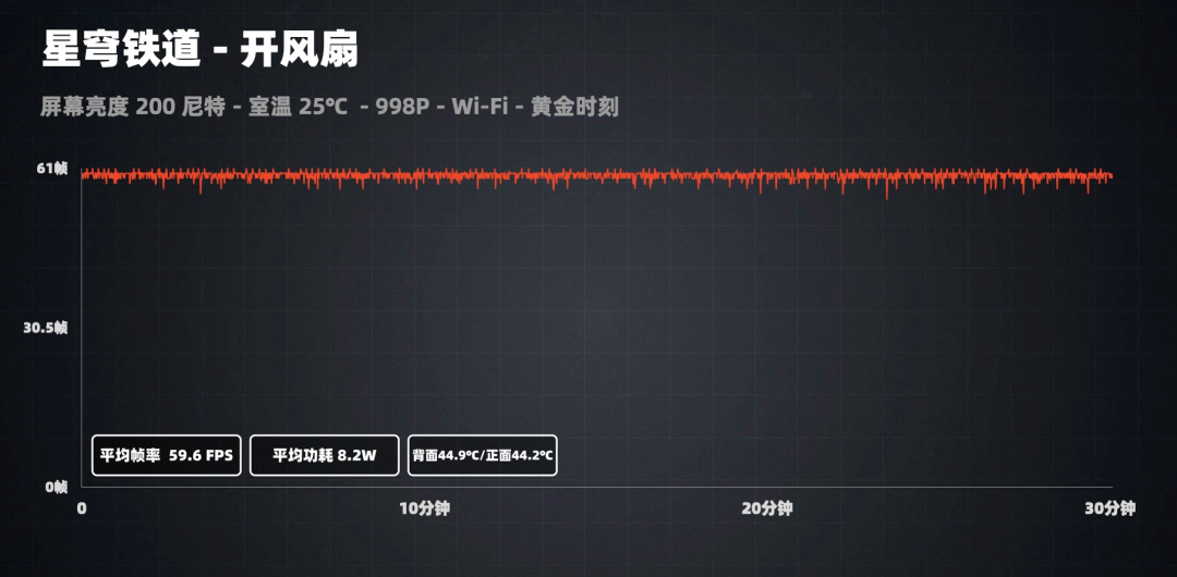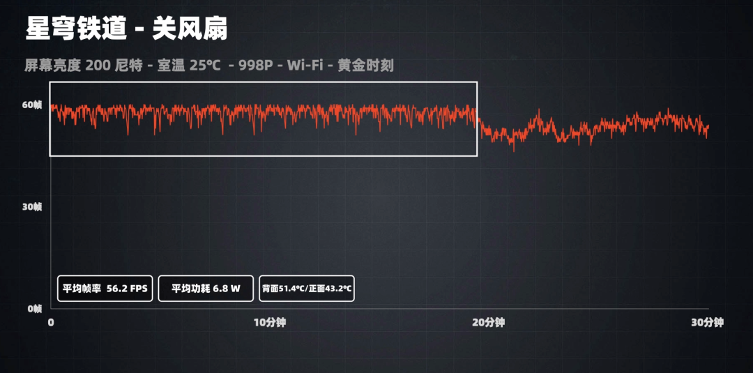 半小时下来平均帧率是 55fps,平均功耗 6.8W。