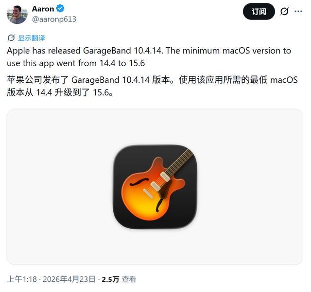 新版还上调了系统兼容性门槛,根据 @aaronp613 反馈,Mac 版库乐队的最低系统要求已从 macOS 14.4 上调至 macOS 15.6。IT之家附上相关截图如下: