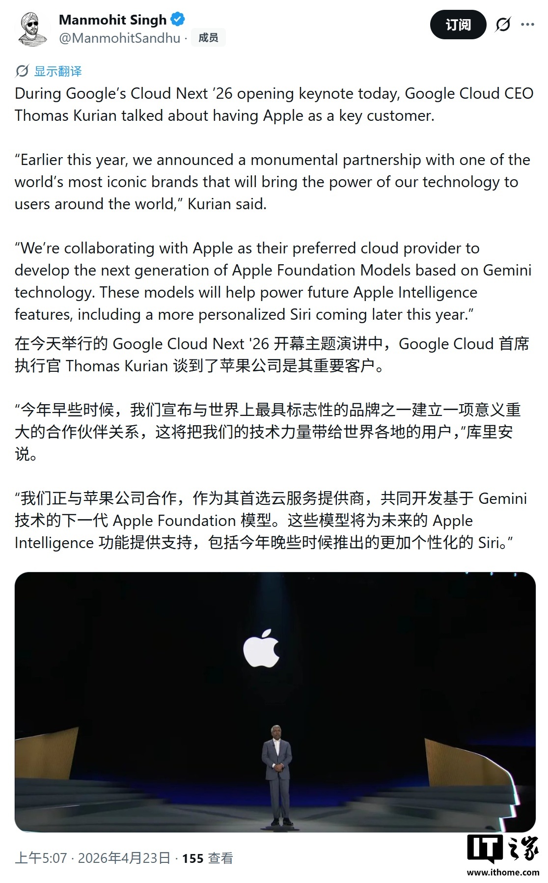 IT之家 4 月 23 日消息,科技媒体 AppleInsider 昨日(4 月 22 日)发布博文,报道称在谷歌 Cloud Next 26 大会主题演讲中,谷歌云首席执行官托马斯 · 库里安(Thomas Kurian)公开确认,基于 Gemini 技术构建的苹果新一代 Siri 将于 2026 年发布。