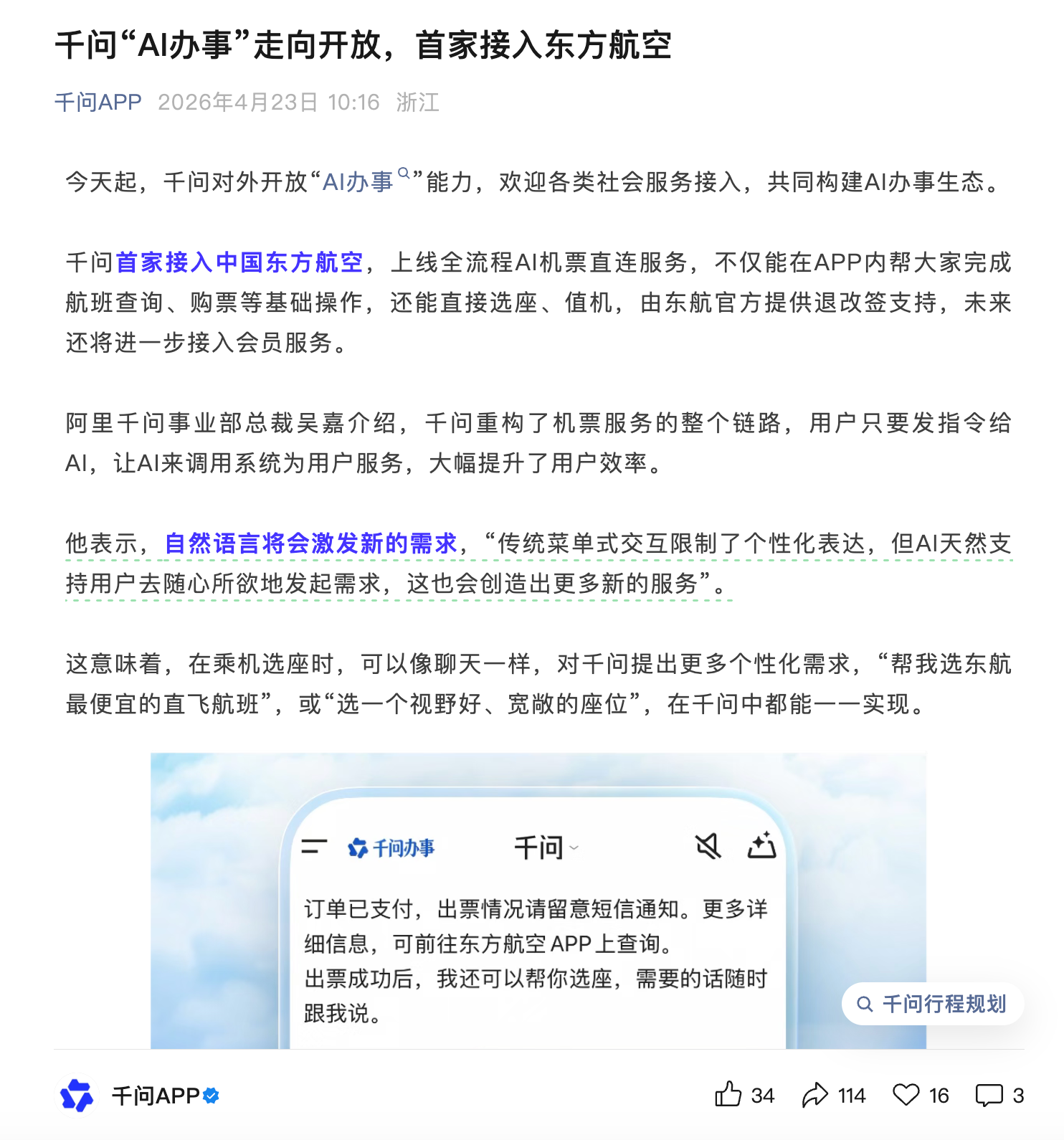 凤凰网科技讯 4月23日,阿里旗下千问App官方宣布,今天起,千问对外开放“AI办事”能力,首家接入中国东方航空,上线全流程AI机票直连服务,能够完成航班查询、购票等基础操作,还能直接选座、值机,由东航官方提供退改签支持,未来还将进一步接入会员服务。此外,去往机场前,主动提醒预约出行车辆等功能,也将陆续上线。