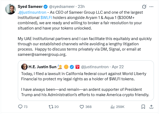 孙宇晨起诉WLFI有续集:有机构愿意帮助庭外和解 财联社4月23日电,Sameer Group LLC的CEO Syed Sameer在X平台回应孙宇晨称,其与Aryam1和Aqua1作为最大的WLFI机构持有者之一(总计超过3亿美元),愿意为孙宇晨达成一个公平的解决方案,并解锁其被锁的代币。注:孙宇晨及其公司周二向旧金山联邦法院提交诉状,起诉美国总统特朗普家族联合创立的加密货币项目World Liberty Financial(WIFI),指控该公司敲诈勒索,并实施“非法计划”来没收他的代币,他和他的公司遭受了“数亿美元的损失”。 Published by 风君子 独自遨游何稽首 揭天掀地慰生平 View all posts by 风君子