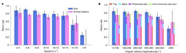 在对手击球之后(球刚离开球拍阶段),Ace与人类选手在不同球速(c)和不同角速度(d)条件下的回球成功率(来源:Nature)