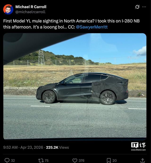 IT之家 4 月 23 日消息,消息源 Michael R Carroll 发文,展示了一张位于美国旧金山湾区的特斯拉 Model Y L 原型车。作为比较,此前特斯拉 CEO 马斯克曾暗示 Model Y L 永远不会进入美国市场,如今看来马斯克似乎已开始“松口”。
