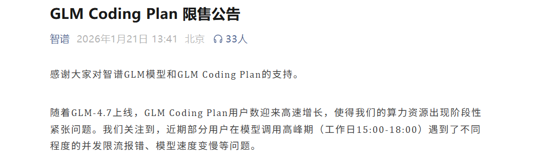 1月21日,智谱发布公告称Coding Plan启动限售。