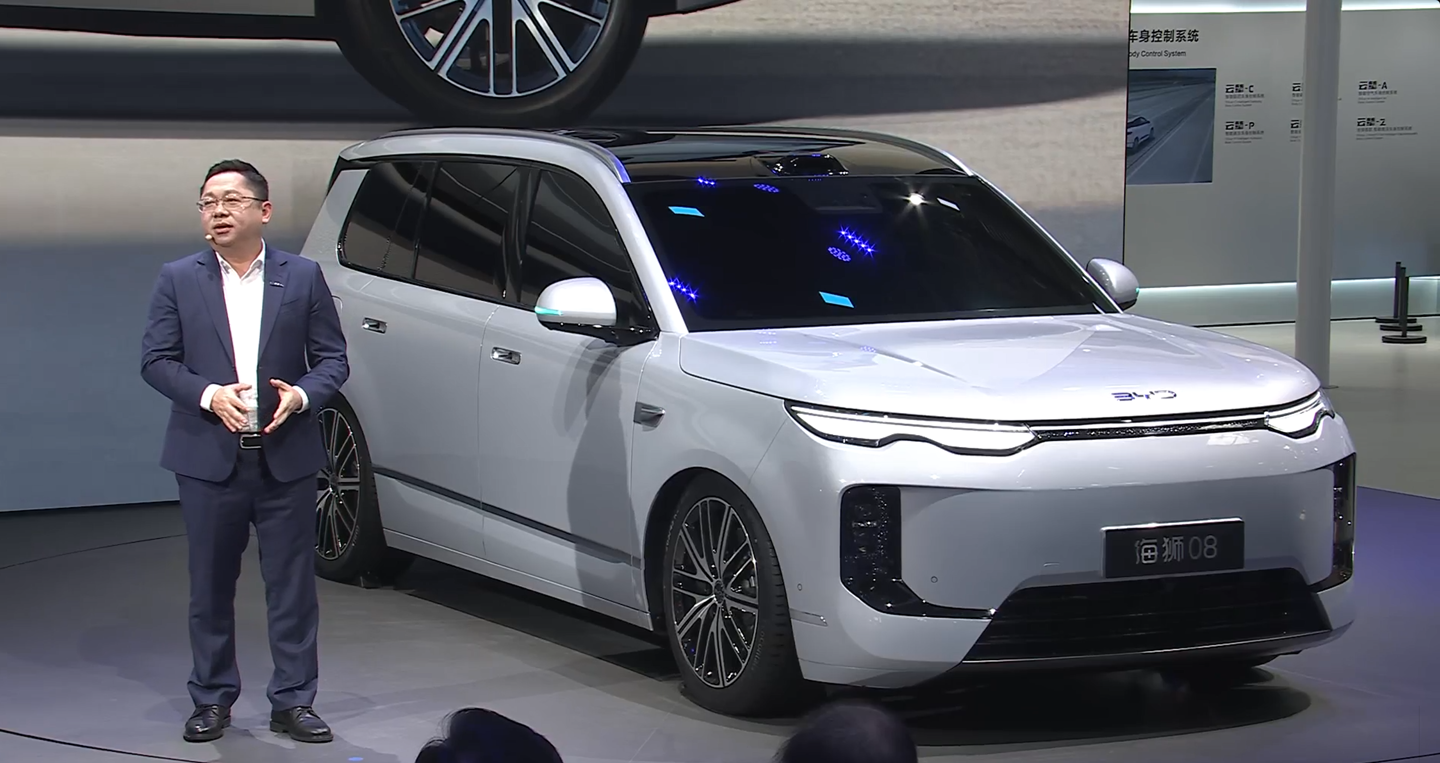 凤凰网科技讯 4月24日,比亚迪海狮08今日在北京车展首发亮相,新车定位大六座旗舰SUV,是比亚迪首款搭载闪充技术的插混SUV。