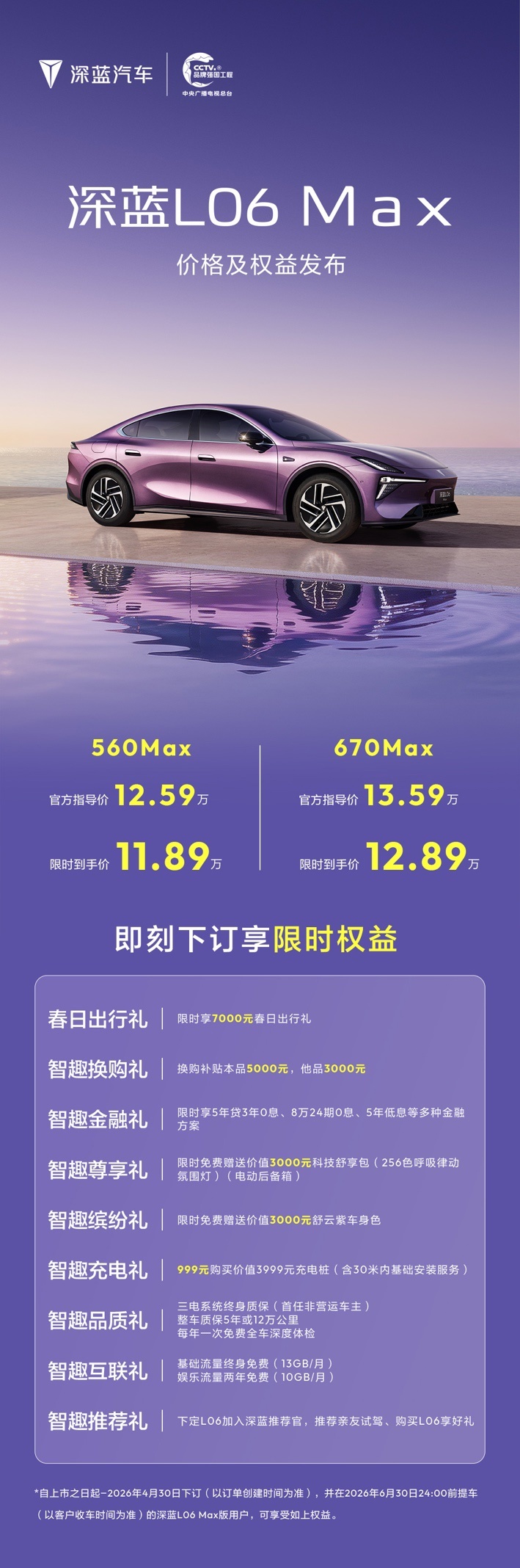 凤凰网科技讯 4月24日,深蓝汽车今日在北京车展推出全新中型纯电轿跑L06 Max。新车共推出560Max和670Max两款配置,官方指导价12.59万元起,限时到手价低至11.89万元起。