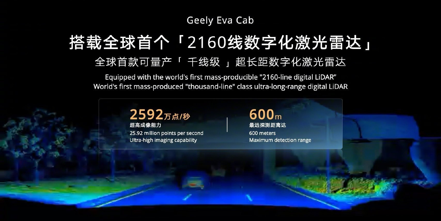 搭载全球首个2160线数字化激光雷达,拥有每秒2592万点的超高成像能力,最远探测距离达600米;同时,该车还会搭载L4级自动驾驶软件方案千里浩瀚G-ASD。