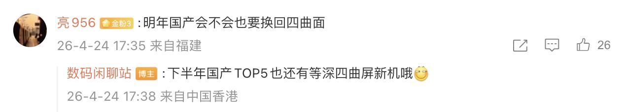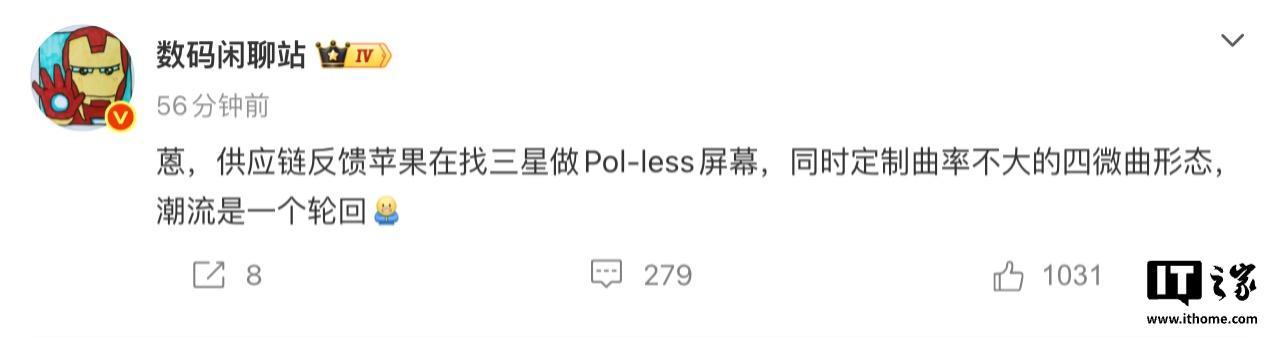 IT之家 4 月 24 日消息,博主 @数码闲聊站 发文,透露供应链反馈苹果正找三星定制“曲率不大的四微曲面板”,相应消息指向了传闻已久的“苹果 20 周年版 iPhone”。同时该博主还透露今年下半年“国产 TOP5”将推出等深四曲面新机。